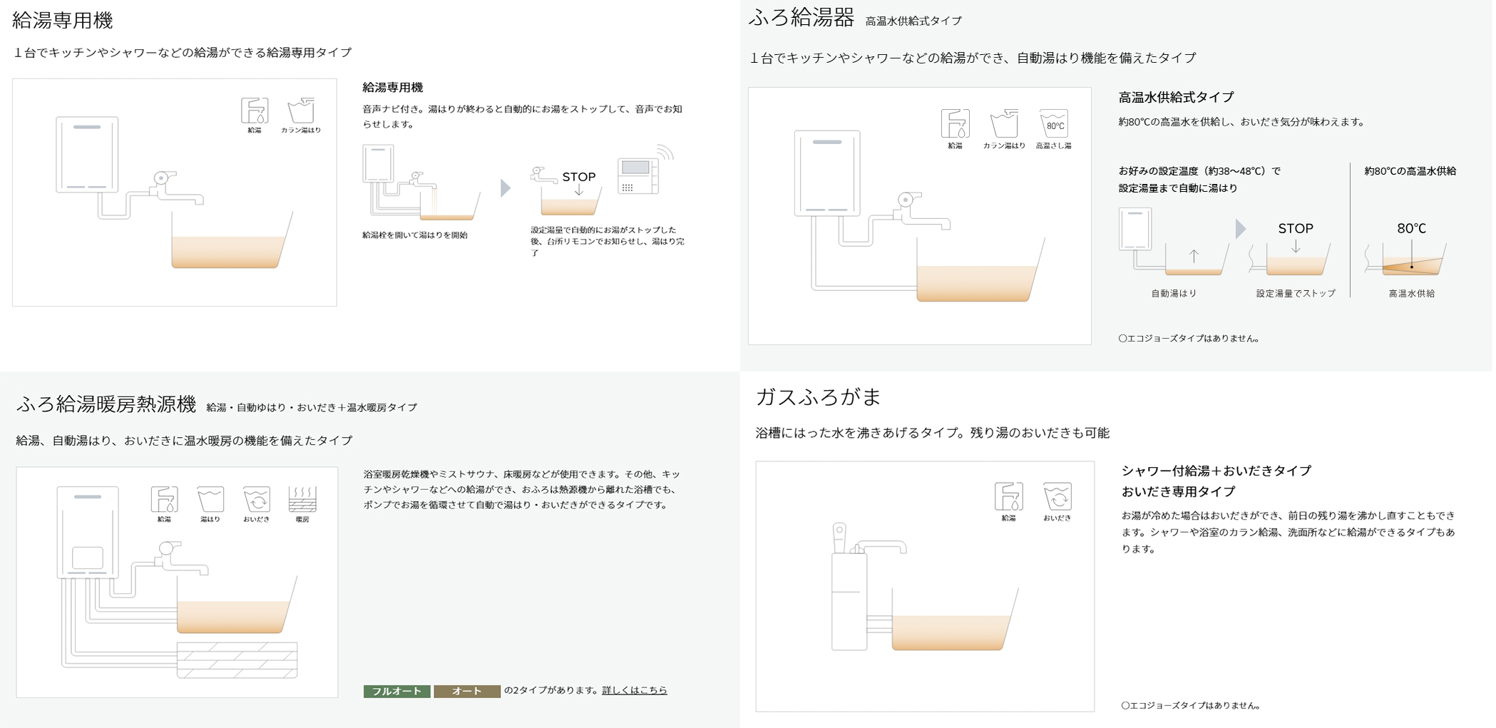 このほかのエコジョーズ給湯器、ウルトラファインバブル、除菌機能がついた給湯器など機能がついた機器があります。お家の状況、予算に応じて適切な給湯器選びをしましょう