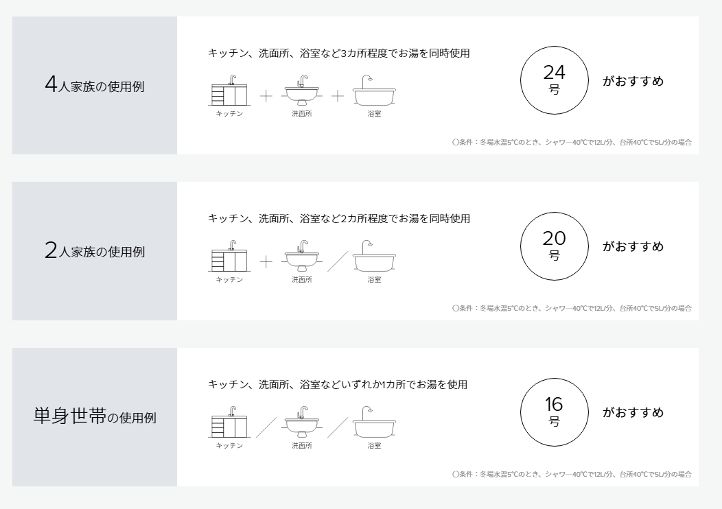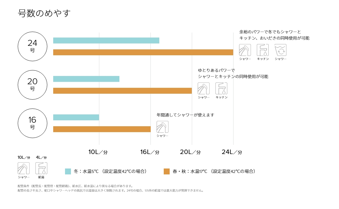 「水温+25℃」のお湯を1分間に何リットル出せるかを表していて、号数が多いほど一度にたくさんお湯を作ることができます。